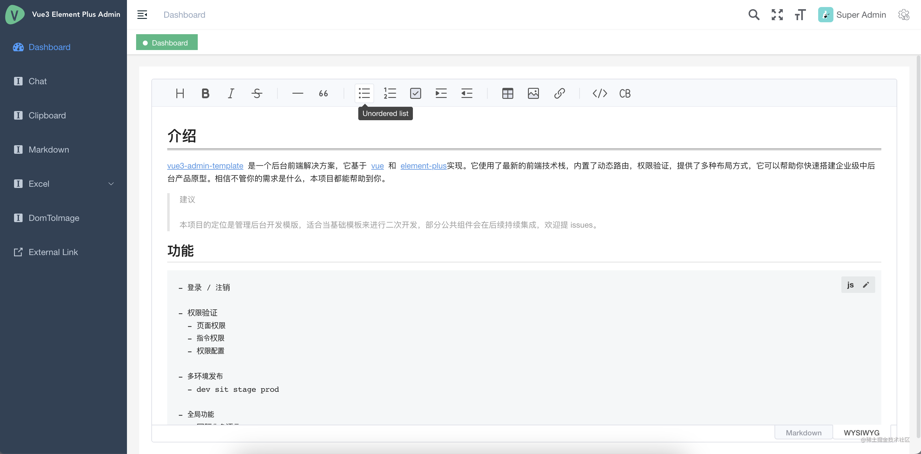 - Screenfull全屏你需要在本地安装 node 和 git。本项目技术栈基于 ES2015+、element-plus、axios、pinia、vue-router和vite和提前了解和学习这些知识会对使用本项目有很大的帮助。